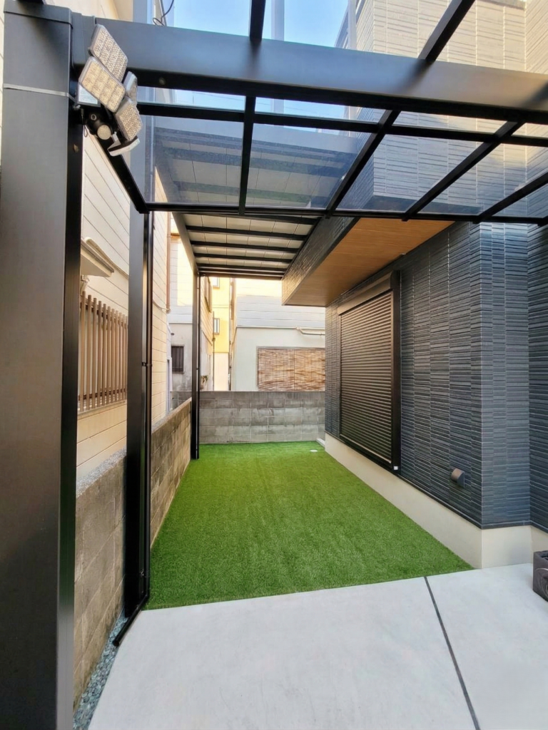 バルコニーの下には人工芝を敷き、雨よけにもなる素晴らしい多目的スペースが生まれました。